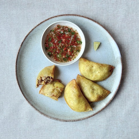 - Mais-Empanadas mit Rindfleisch, Kartoffelfüllung dazu Ají (Sauce aus Koriander, Tomaten, Lauchzwiebeln, Chili, Zitrone und Keimöl) (Kolumbien)